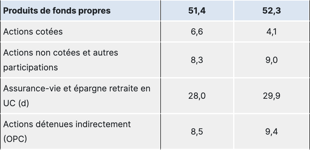Dans ce total, les produits de fonds propres (actions cotées, non cotées, unités de compte d’assurance-vie, actions via OPC) représentent un pilier majeur :